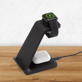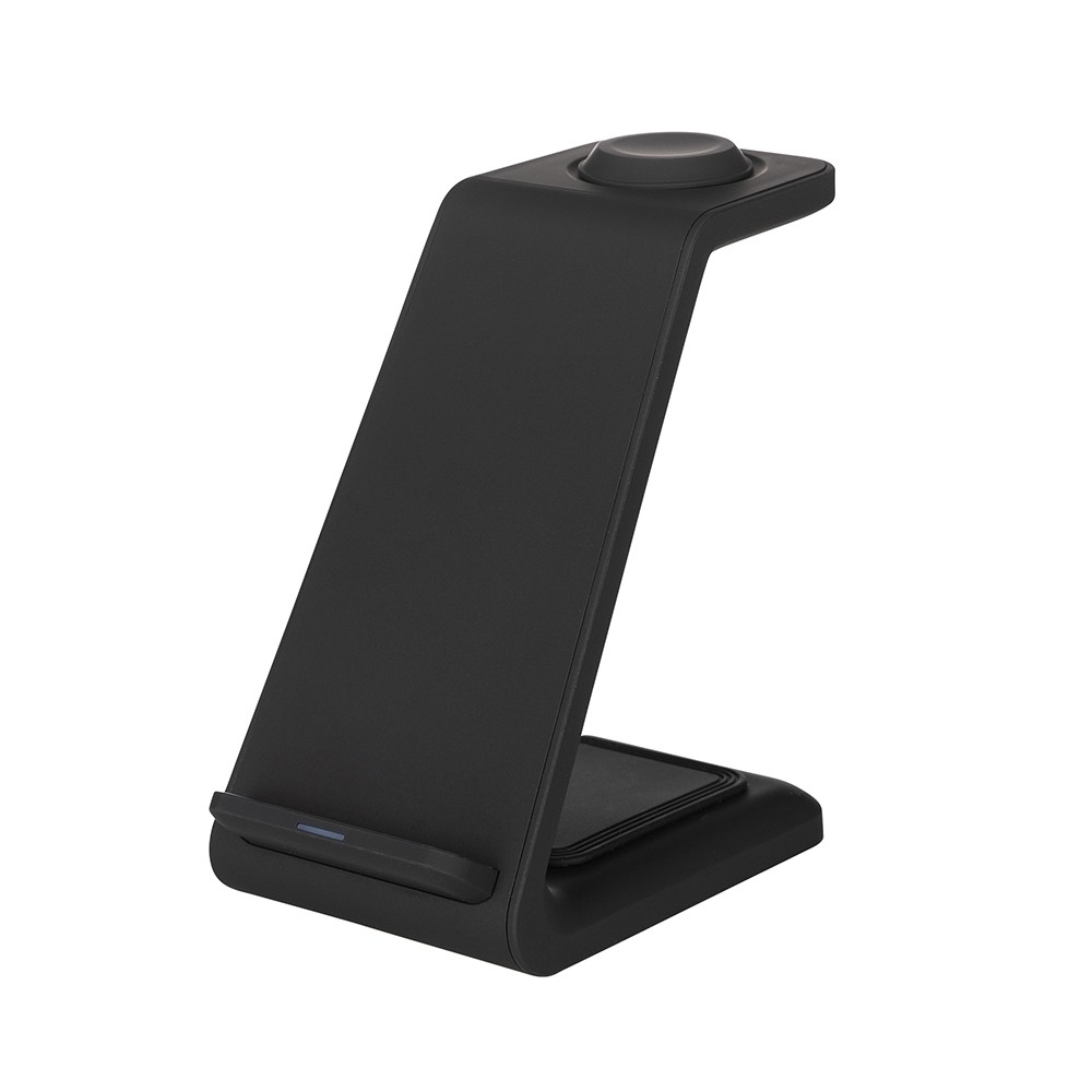 Descrição: Base de carregamento 3 em 1 via indução. Capaz de carregar simultaneamente celular, Iwatch e fones de ouvido através da tecnologia de indução QI, a base contém frestas para auxilio da circulação de ar, acelerando o resfriamento e proporcionando uma dissipação de calor ideal ao produto. Acompanha cabo USB tipo C.