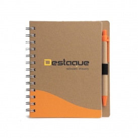 Descrição: Bloco de anotações ecológico com caneta, capa produzida em papelão com detalhe texturizado e verso liso. Contém miolo com aproximadamente 70 folhas pautadas, suporte de nylon e acompanha caneta de papelão com clip e ponteira de plástico, carga esferográfica 1.0mm e acionamento por clique.