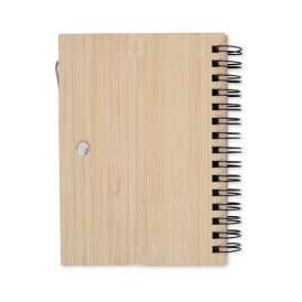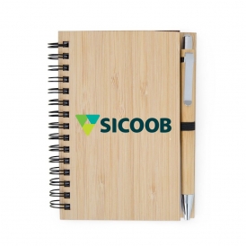 Descrição: Bloco de anotações ecológico com caneta. Capa de bambu. Possui aproximadamente 50 folhas brancas pautadas. Acompanha uma caneta de bambu com detalhes em metal.