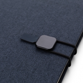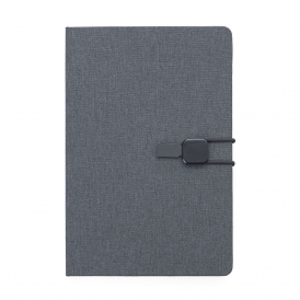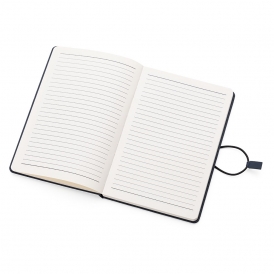 Descrição: Bloco de anotações com capa dura em tecido de poliéster. Miolo com 80 folhas pautadas na cor bege. Possui elástico lateral com detalhe em couro sintético para fechamento do caderno.