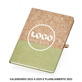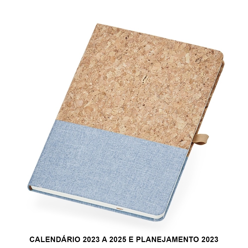 Descrição: Caderneta A5 de cortiça com detalhe em linho e suporte para caneta, contém marcador de página em cetim, página para dados pessoais, calendário, páginas de planejamento e aproximadamente 93 folhas marfim com pauta.