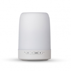 Descrição: Caixa de som multimídia com luzes, suporte para celular e porta caneta. Material plástico resistente na cor branca fosca, parte superior com falante vazado na área interna, pode ser utilizado como porta caneta ou suporte para celular. Parte inferior branca leitosa com linhas em relevo, borracha inferior anti deslizante e alça de alumínio.