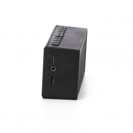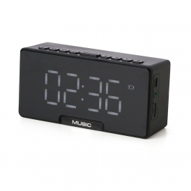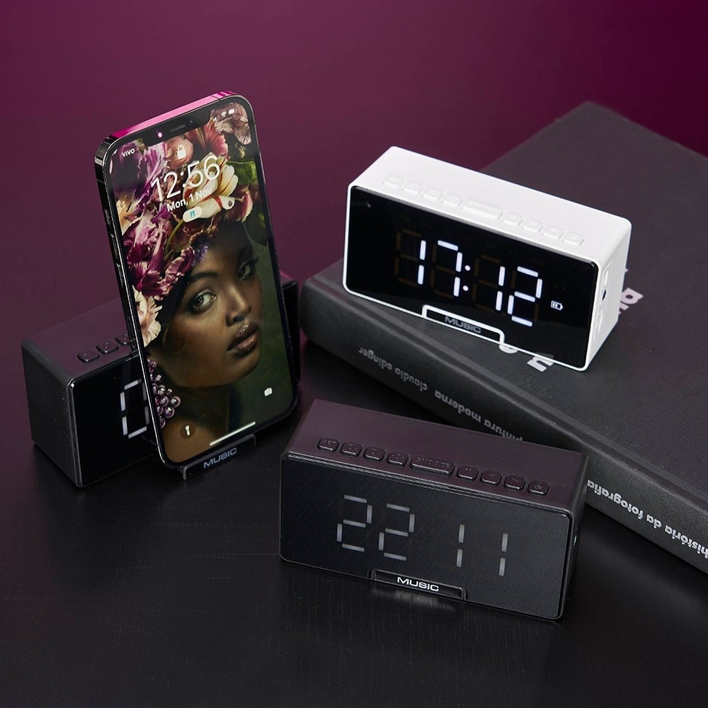 Descrição: Caixa de som multimídia com relógio despertador e suporte para celular. Produzida em plástico e com borrachas antiderrapantes na área inferior, a caixa de som tem a área frontal com display de LED, além de um compartimento com suporte para celular – uma espécie de “gaveta” aonde é exibido (MUSIC), basta puxá-la ter acesso ao compartimento. A caixa de som executa nos modos bluetooth, car