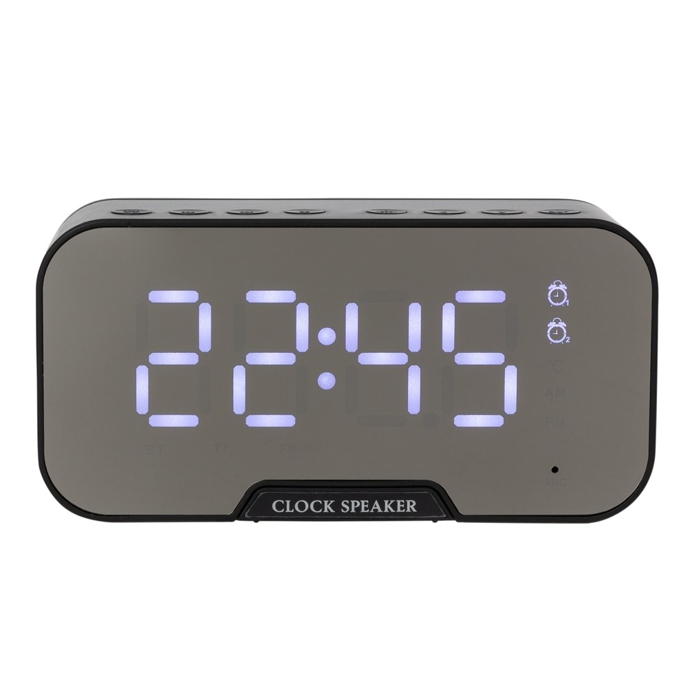 Descrição: Caixa de som multimídia com relógio despertador e suporte para celular. Produzida em plástico e com borrachas antiderrapantes na área inferior, a caixa de som tem a área frontal espelhada e display de LED, além de um compartimento com suporte para celular – uma espécie de “gaveta” aonde é exibido (CLOCK SPEAKER), basta puxá-la ter acesso ao compartimento. A caixa de som executa nos modo