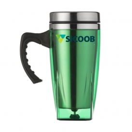 Descrição: Caneca acrílica 450ml com fundo quadrangular com cabo plástico resistente, detalhes na tampa e compartimento interno de inox. Tampa plástica com compartimento que pode ser aberto para beber(não é térmica).