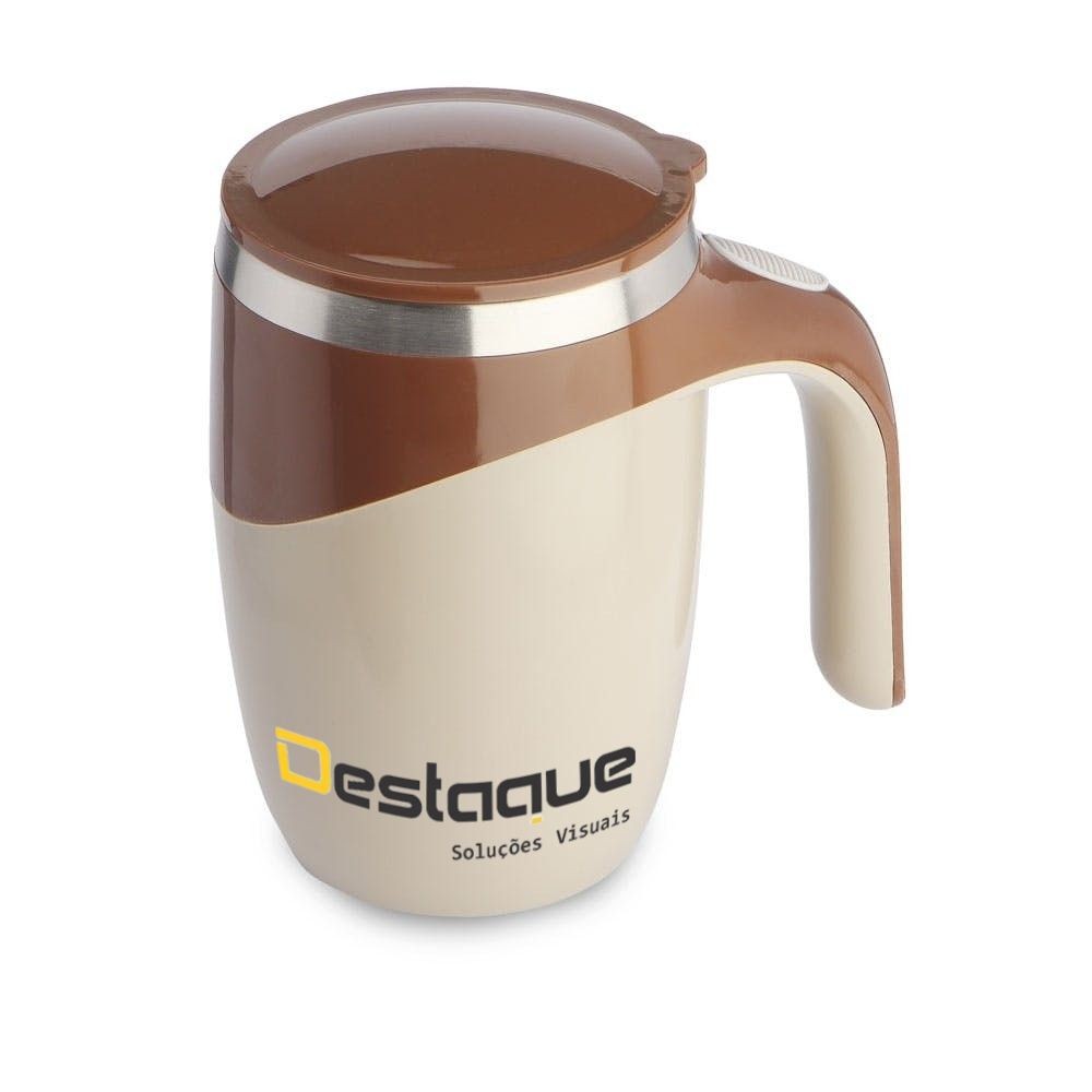 Descrição: Caneca plástica com misturador 400ml com a parte interna em inox. Acompanha tampa plástica. Possui uma hélice removível no formato capsula. Para o funcionamento é necessário 2 pilhas AAA. OBS: Não acompanha pilha.