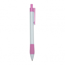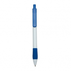Descrição: Caneta plástica com detalhe emborrachado, carga esferográfica azul e acionamento por clique.