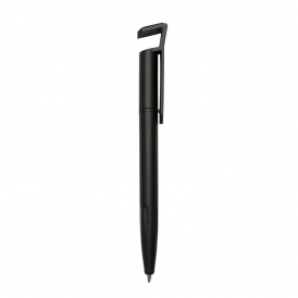 Descrição: Caneta plástica com suporte para celular, ponteira touch screen e limpador de tela. Carga esferográfica azul e acionamento por rotação.