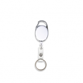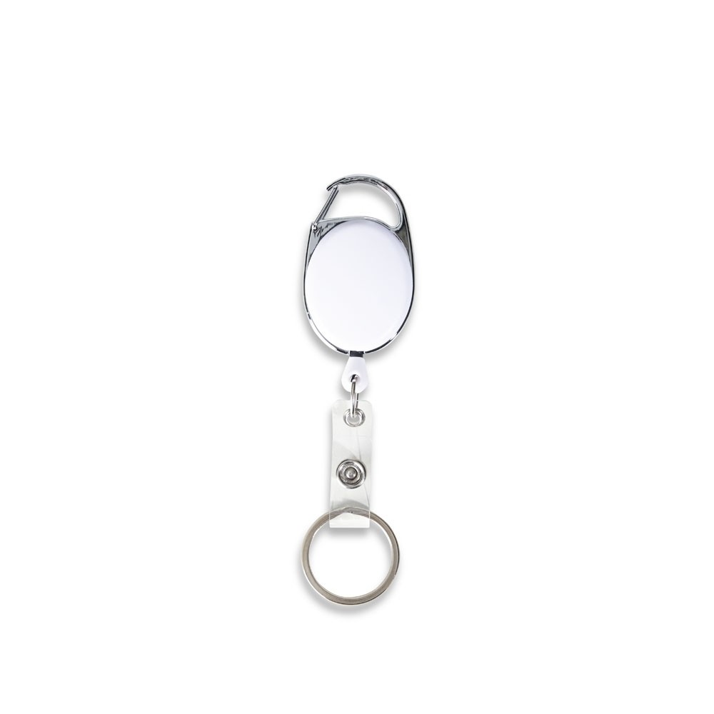 Descrição: Chaveiro estilo mosquetão retrátil com porta crachá. Feito de metal e PVC. Acompanha argola em inox para chaveiro e suporte transparente para crachá com botão de pressão. Possui um clip atrás para pendurar.