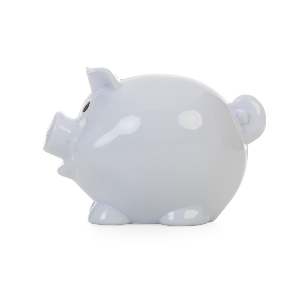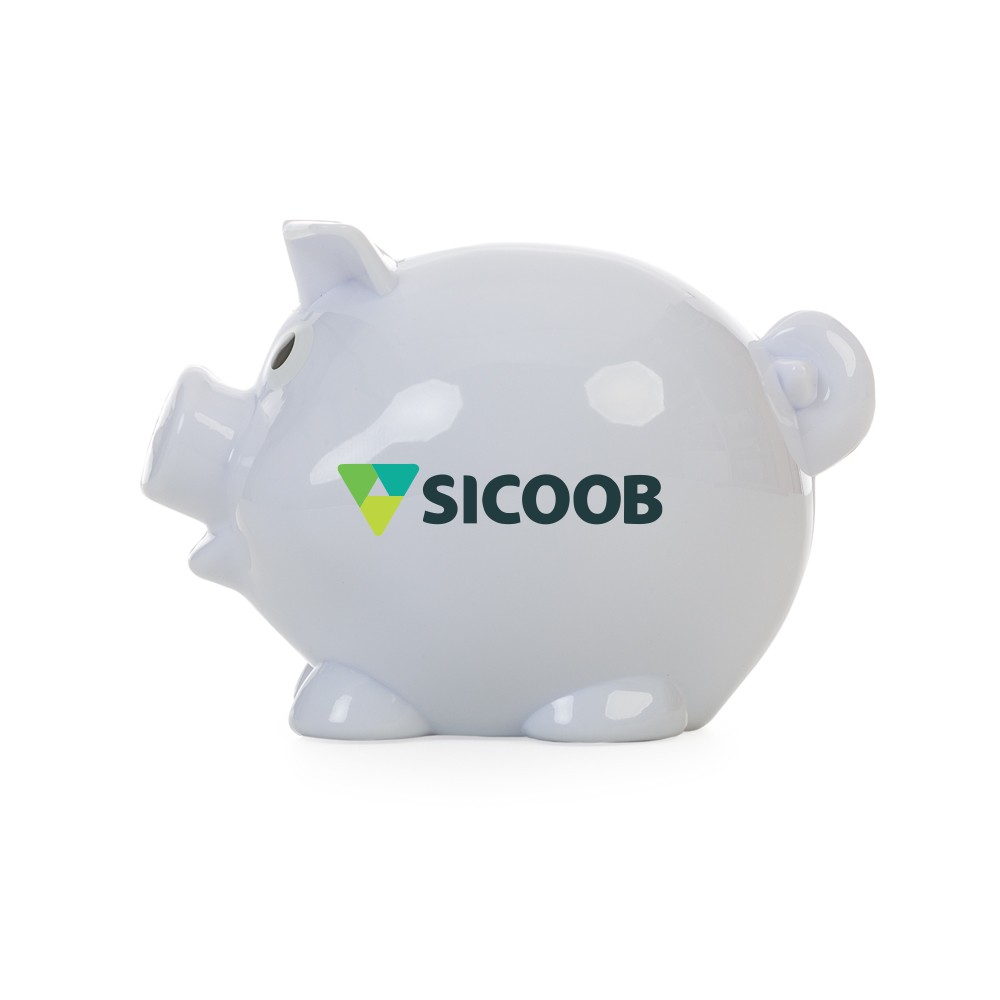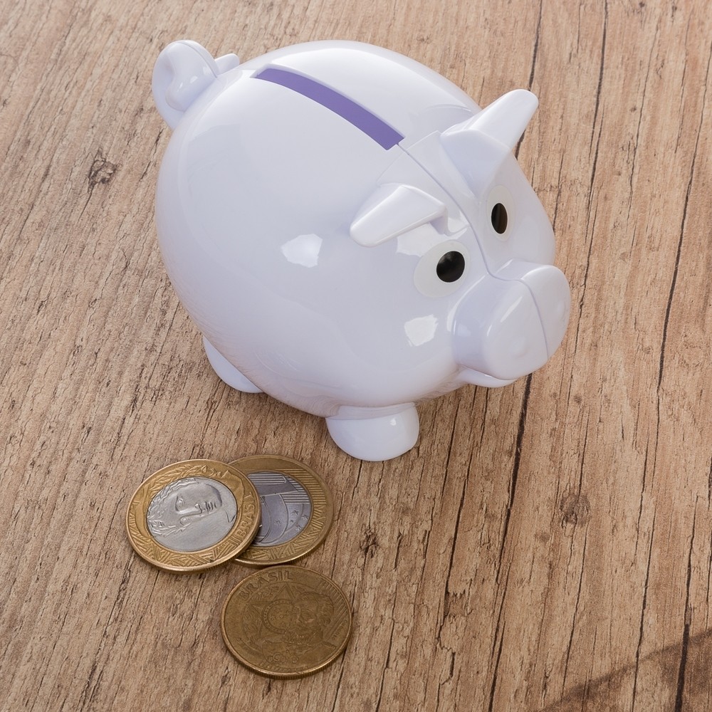 Descrição: Cofre plástico resistente formato porquinho na cor branca. Para abri-lo basta rotacionar o compartimento na parte inferior conforme indicam as setas.