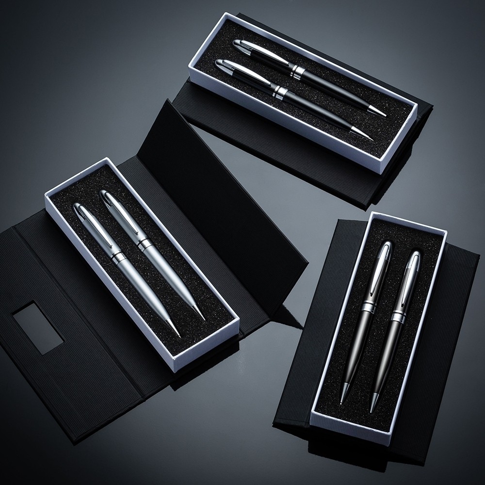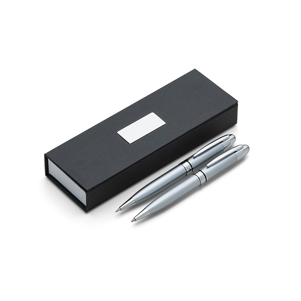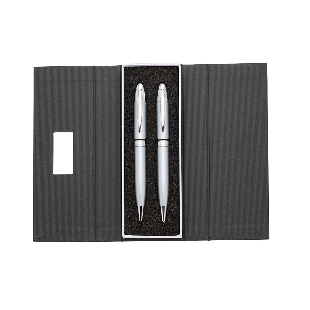 Descrição: Conjunto caneta e lapiseira em estojo de cartonagem com placa central para personalização. Clip metal e anel central possui: anel fino prata, anel preto fino e um anel maior prata com relevo e acionam por giro. Estojo revestida com espuma na parte interna.