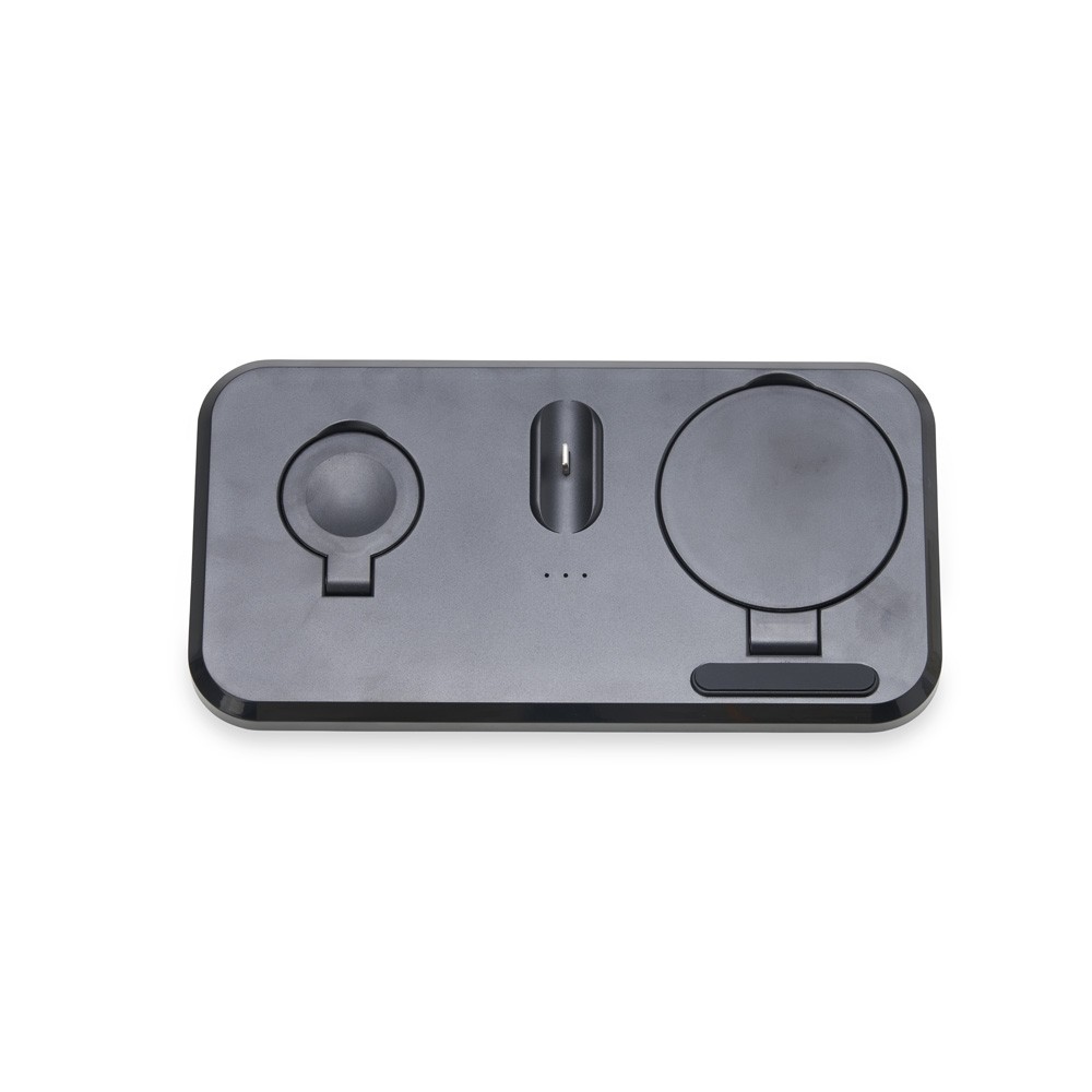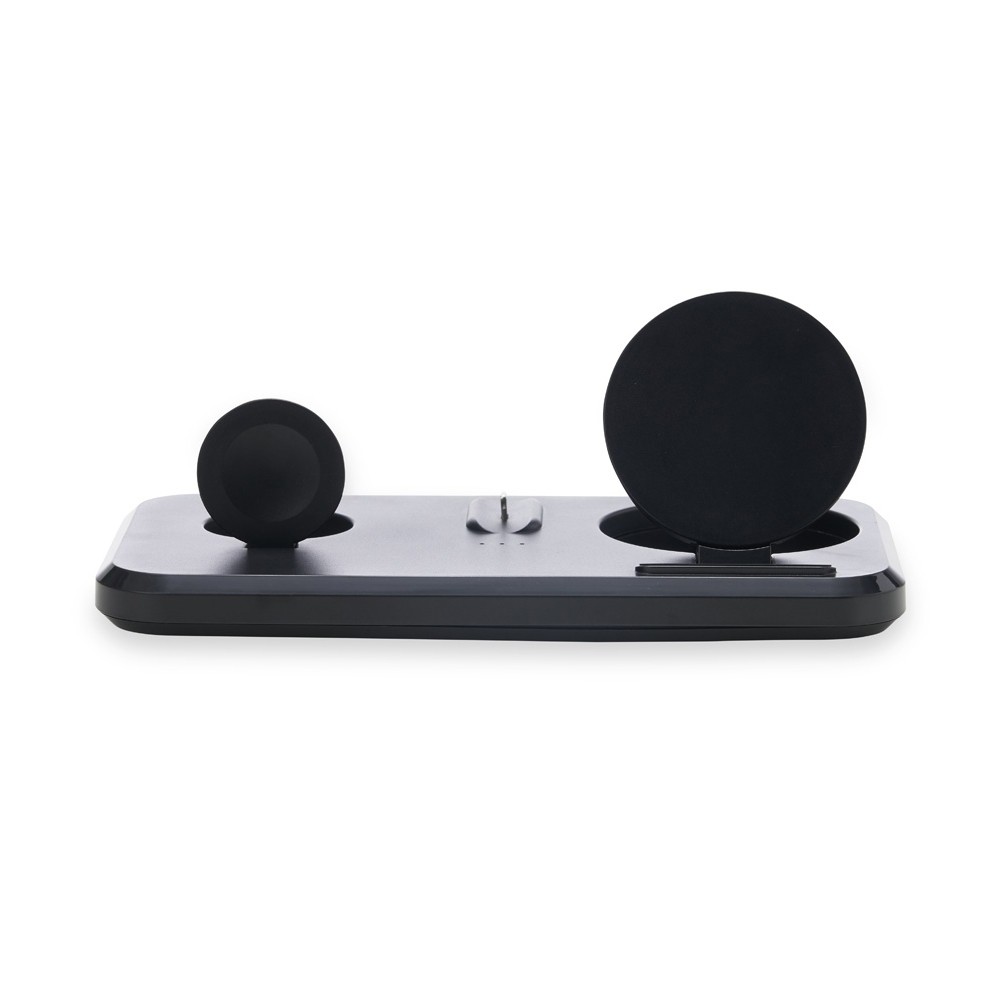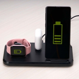 Estação de carregamento 3 em 1 para celular, iwatch e fones com entrada Lightning. Com sistema de carga por indução rápida, a estação permite o carregamento sem fio de celulares e iwatchs habilitados com estas tecnologias, além destes suportes, a estação conta ainda com um carregador para fones através do conector Lightning. Sua base contém tapetes de silicone antiderrapantes. Acompanha cabo USB.
