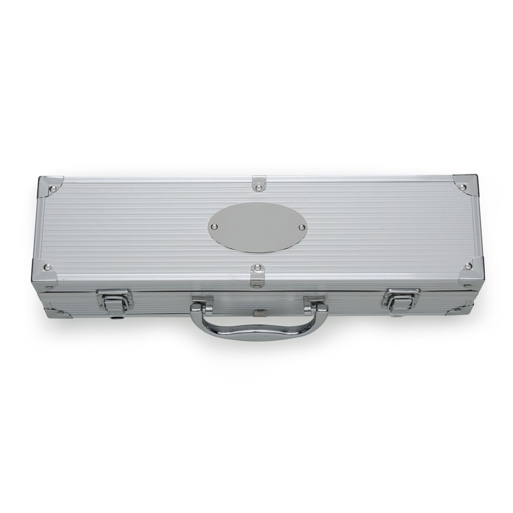 Descrição: "Kit churrasco 3 peças em maleta de alumínio com relevo. Possui: faca, garfo e pegador em inox(todas peças possuem proteção plástica) detalhes em metal nas bordas da maleta, duas dobradiças na parte inferior, uma alça e duas presilhas para travar/abrir maleta. Parte interna revestida de tecido tnt e velcro para guardar as peças." observação: Maleta 11,9 cm x 37 cm x 7,8 cm – Faca 32,5 c