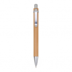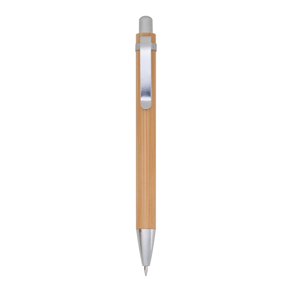 Descrição: Kit ecológico caneta e lapiseira em bambu com estojo de papelão. Carga esferográfica azul. Acionamento por clique.