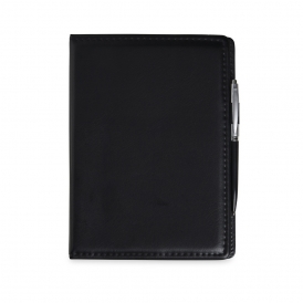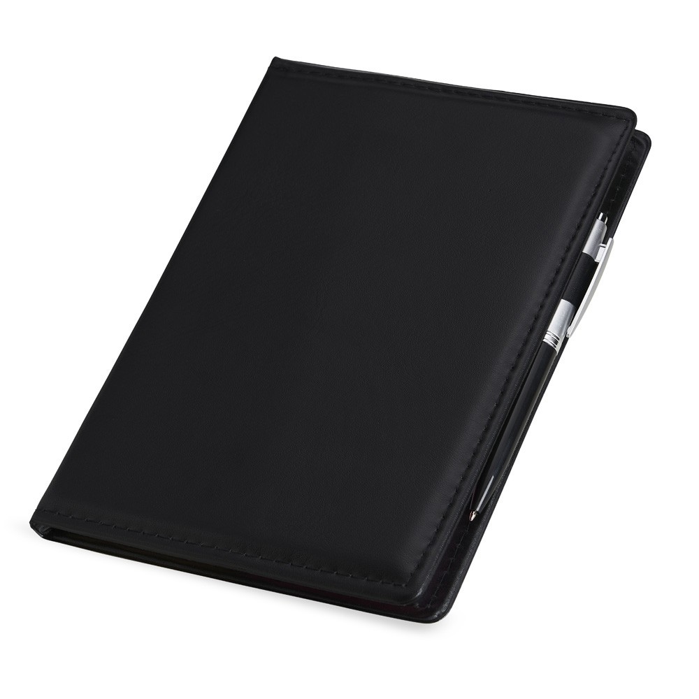 Descrição: Kit para anotações em couro sintético com autoadesivos e caneta plástica. Contém seis blocos com aproximadamente 50 folhas, conjunto de cinco marcadores plásticos autoadesivos com aproximadamente 26 folhas, bloco A5 com aproximadamente 50 folhas e caneta esferográfica com carga azul e acionamento por clique.