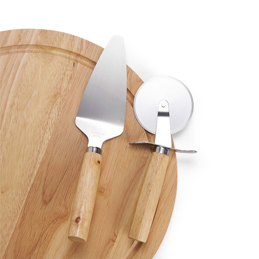 Descrição: Kit pizza 3 peças, contém: tabua de bambu com canaleta, espátula de inox com cabo de bambu e cortador de pizza de inox com cabo de bambu.