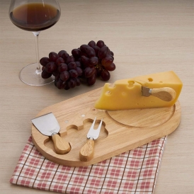 Descrição: Kit queijo 4 peças, contém: tábua de bambu com canaleta, faca com ponta, garfo e espátula. Tábua com imã para encaixe e fixação dos utensílios.