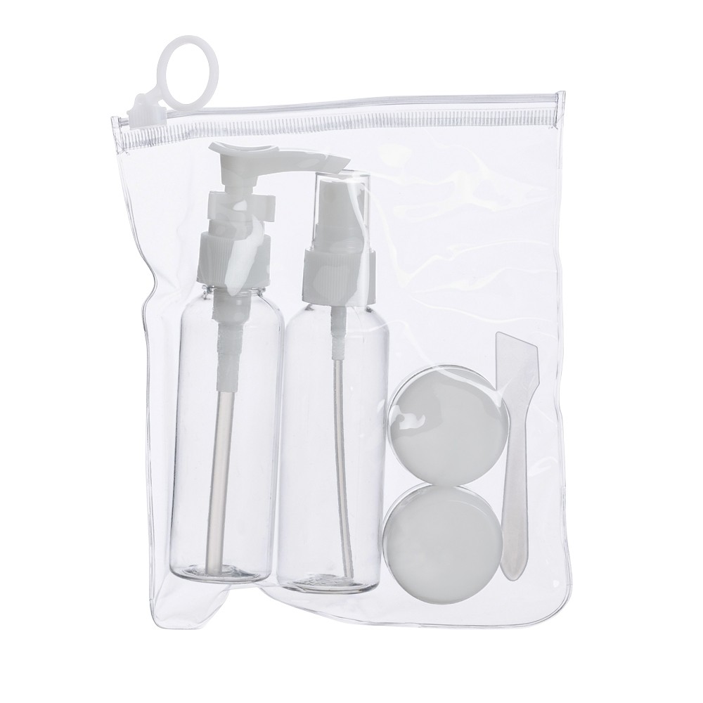 Descrição: Kit viagem 5 peças em estojo ziplock. Contém frasco de 70ml com tampa spray; frasco de 70 ml com tampa pump; 2 potes de 10ml com tampa rosqueável e mini espátula fosca. Frascos plásticos e estojo em pvc com puxador plástico.