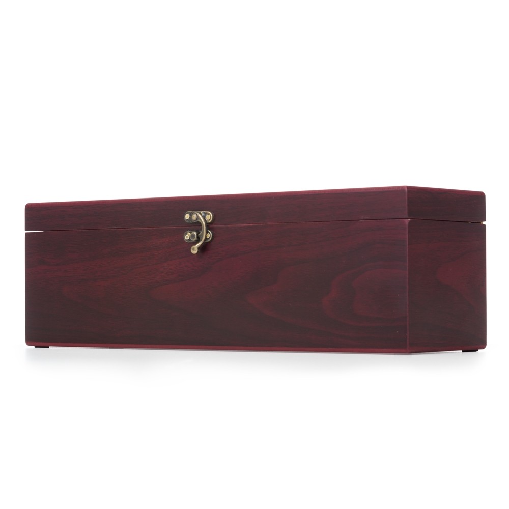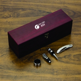 Descrição: Kit vinho 4 peças em maleta de madeira na cor vinho. Possui: wine collar, bico condutor com tampa, tampa de bico e saca rolha. Parte interna revestida com espuma e tecido amarelo, possui dobradiças douradas e trava metálica, parte inferior com borrachas anti-deslizantes. NÃO ACOMPANHA A GARRAFA DE VINHO