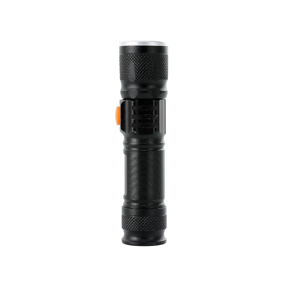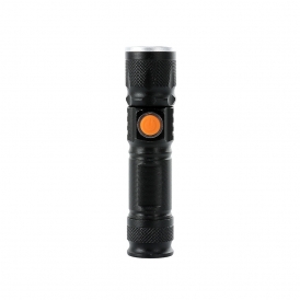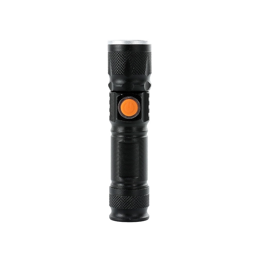 Descrição: Lanterna led recarregável com zoom de regulagem e três estágios de iluminação, material metálico com USB acoplado para carregamento. Acompanha cordão de nylon.