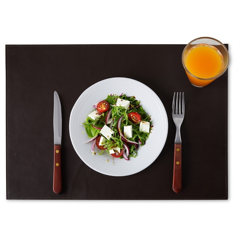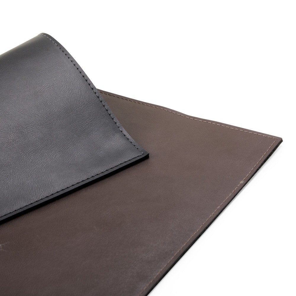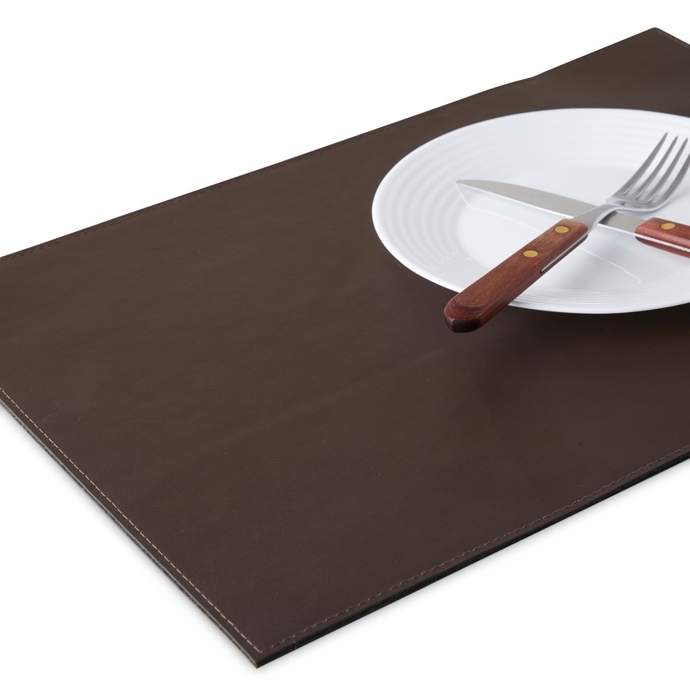 Descrição: Lugar Americano dupla face, couro sintético. Sendo uma face na cor preto e a outra na cor marrom.