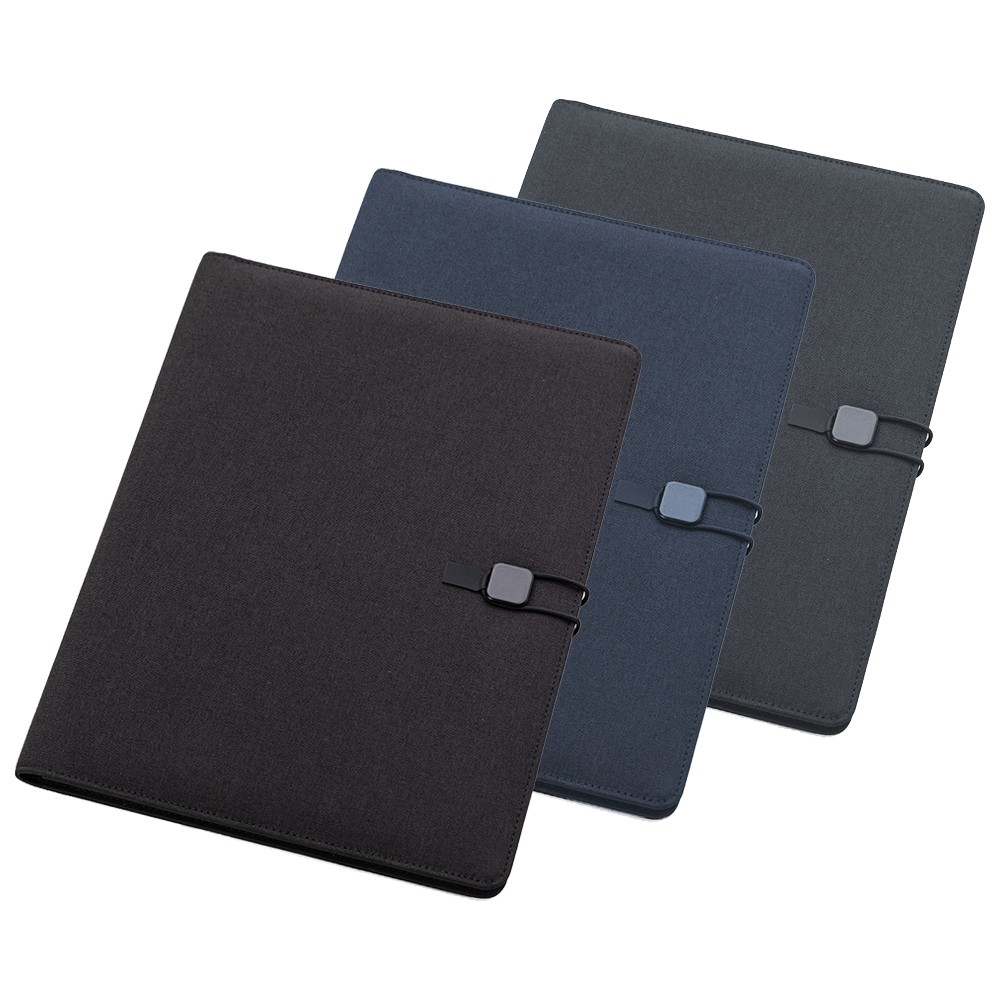 Descrição: Pasta convenção com capa almofadada em tecido de poliéster. Contém 20 folhas para anotação, porta canetas, porta documentos e porta cartão internos. Possui elástico lateral com detalhe em couro sintético para fechamento da pasta.