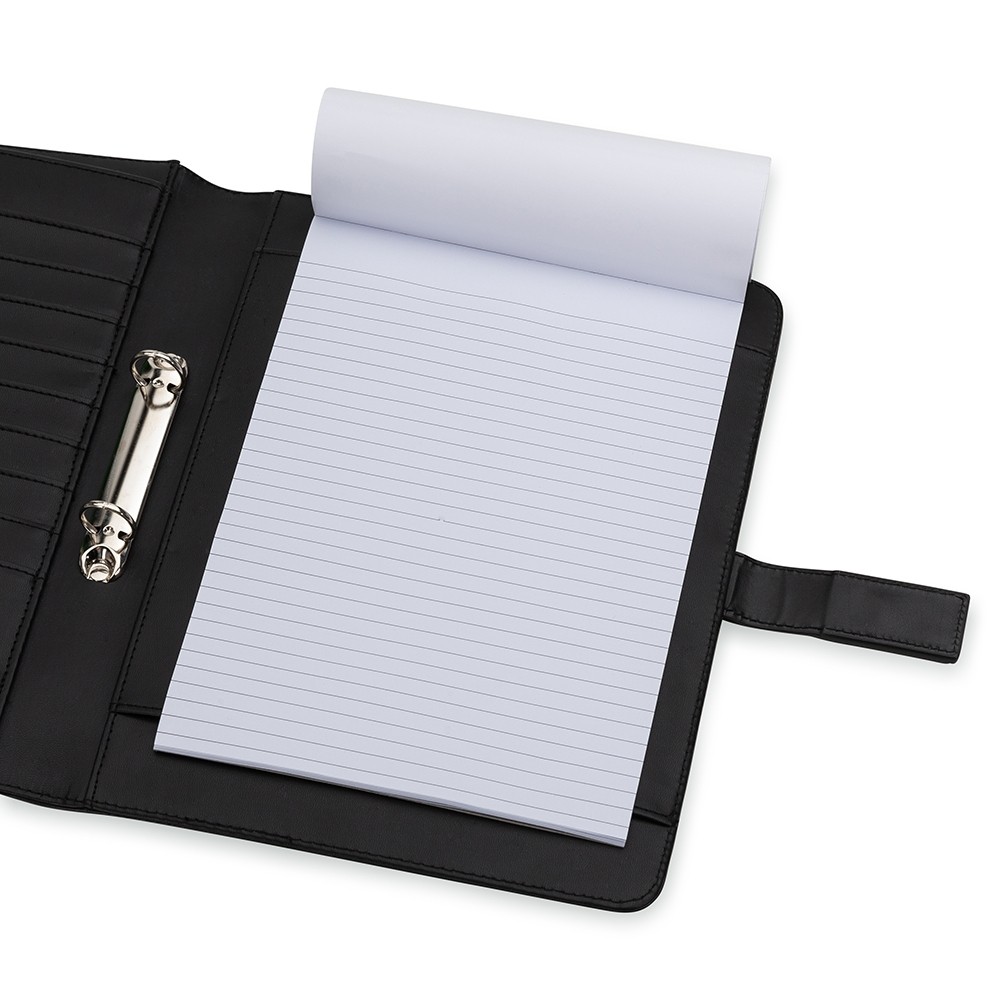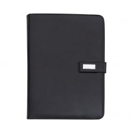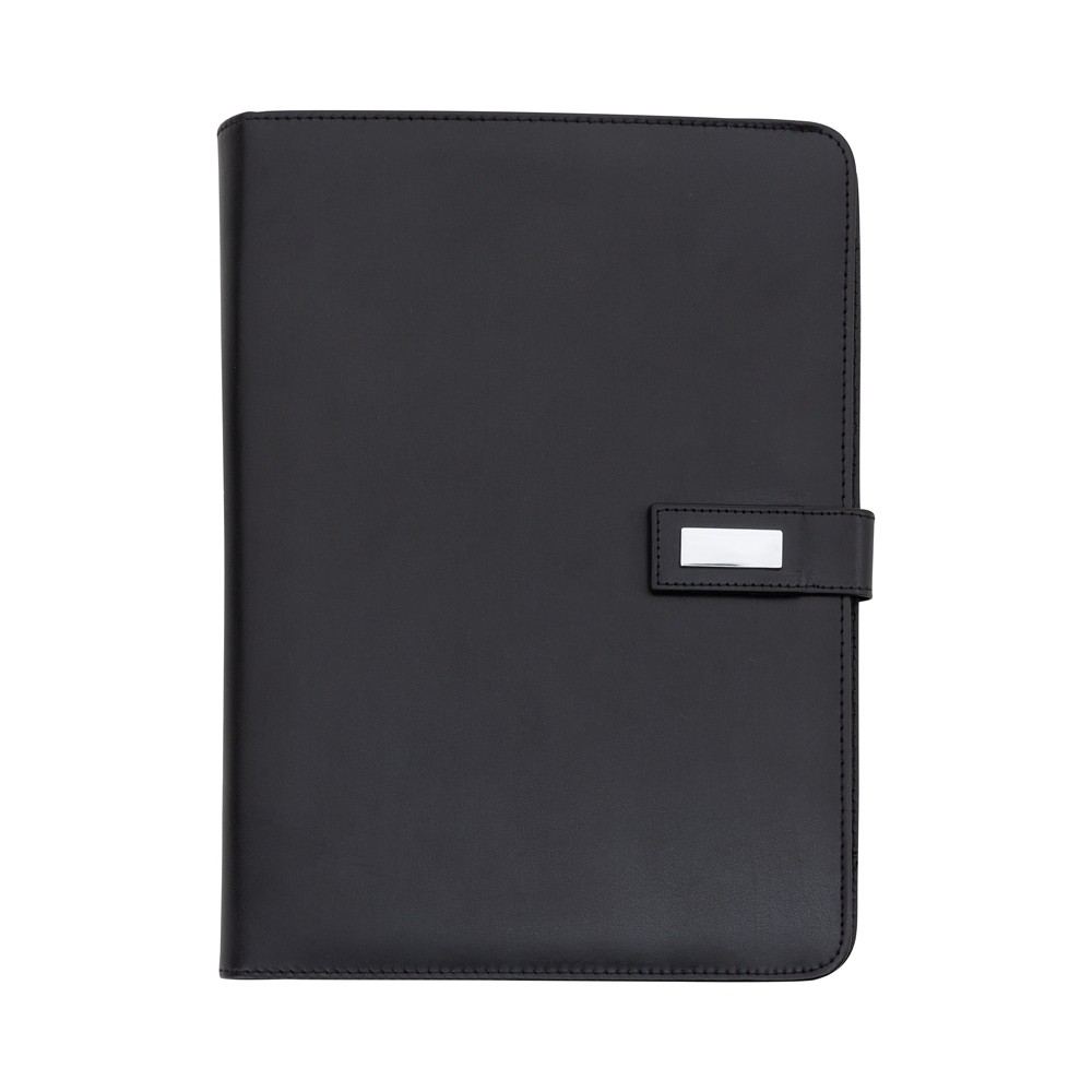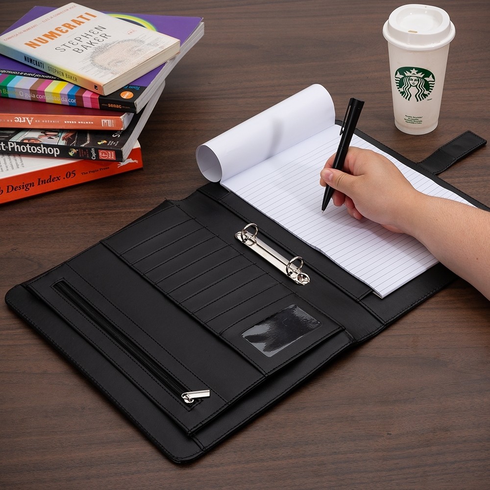 Descrição: Pasta convenção com fecho imantado e plaquinha personalizável. Produzido em couro sintético, a pasta contém bolso lateral na contracapa e bolso com fechamento em zíper, além divisórias para cartões e/ou documentos com bolso lateral. Possui acesso para fichário de duas argolas e compartimento para bloco de folhas com aproximadamente 20 folhas brancas com pauta.