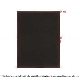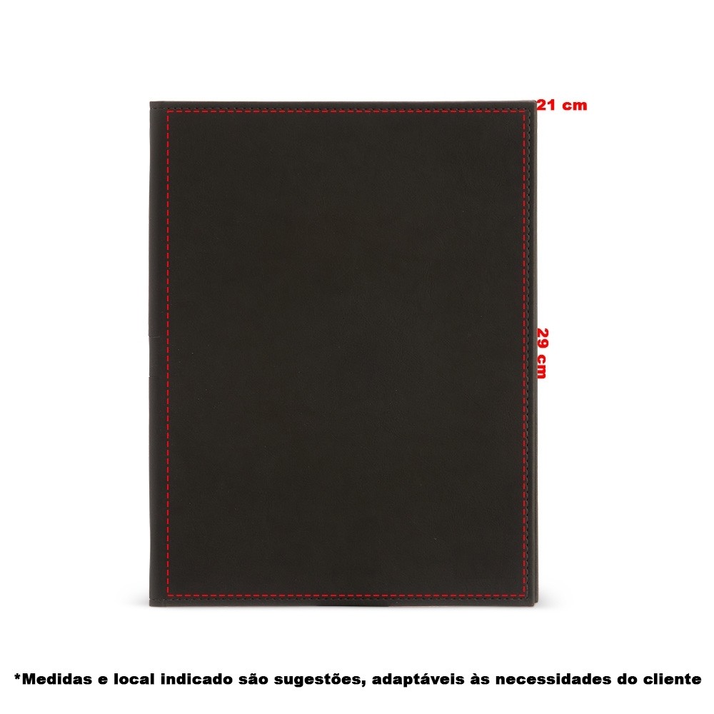 Descrição: Pasta convenção de couro sintético, possui porta caneta, compartimento para arquivar documentos, dois bolsos para cartões e um bloco com aproximadamente 25 folhas brancas não pautadas.