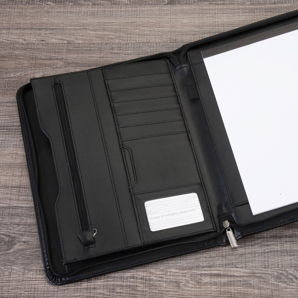 Descrição: Pasta convenção de couro sintético com zíper, possui 2 compartimentos grandes para arquivar documentos, compartimento interno com zíper, 7 divisórias pequenas para documentos, suporte com visor para cartão de identificação, suporte para caneta(não acompanha caneta) e bloco com 20 folhas pautadas.