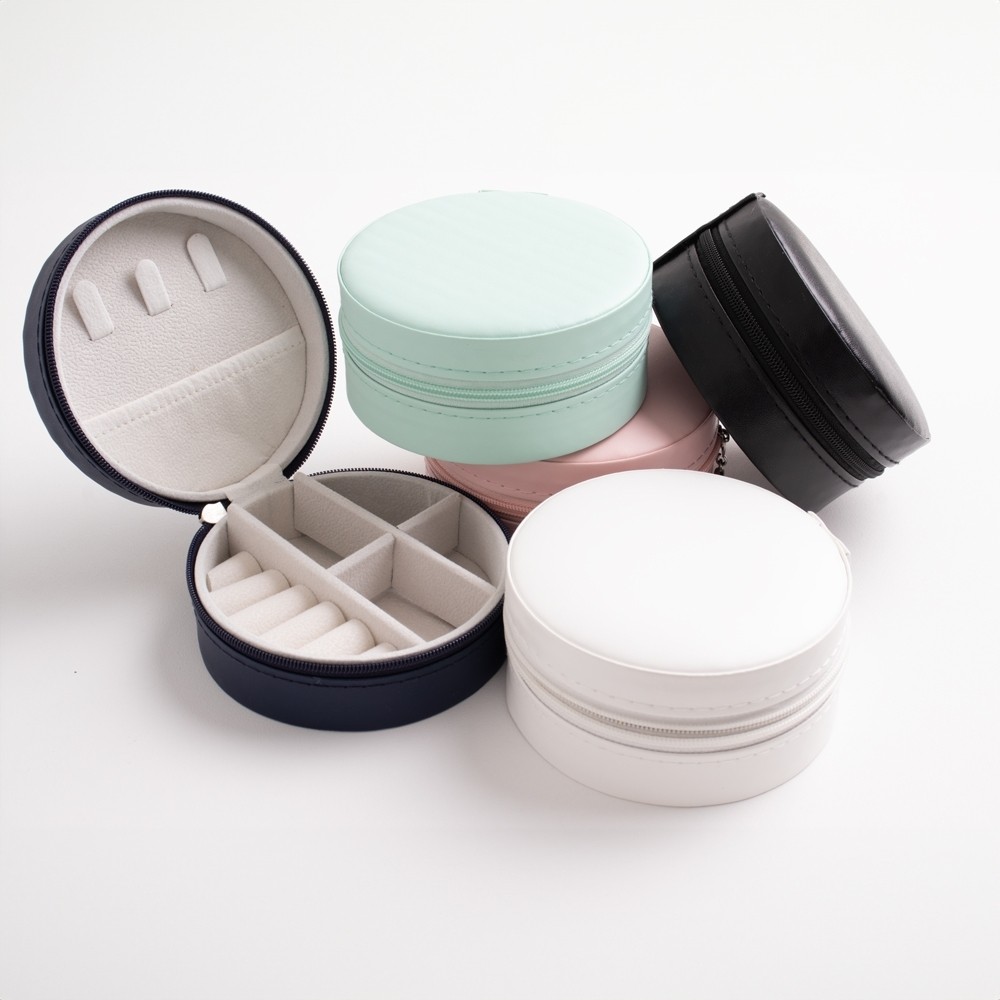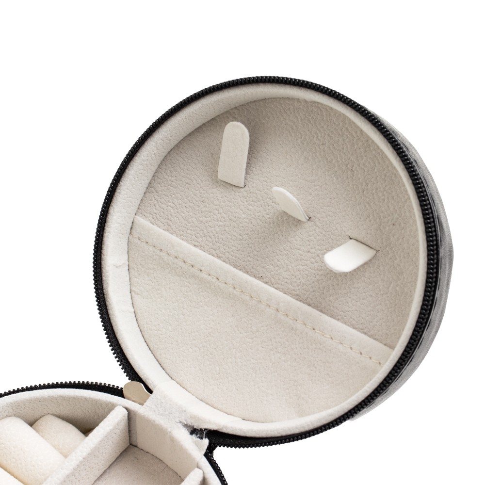 Descrição: Porta joias de couro sintético com revestimento aveludado. Possui compartimentos internos para anéis, brincos, pulseiras e colares.