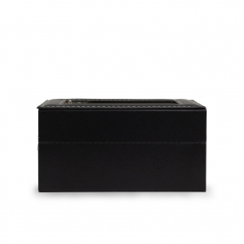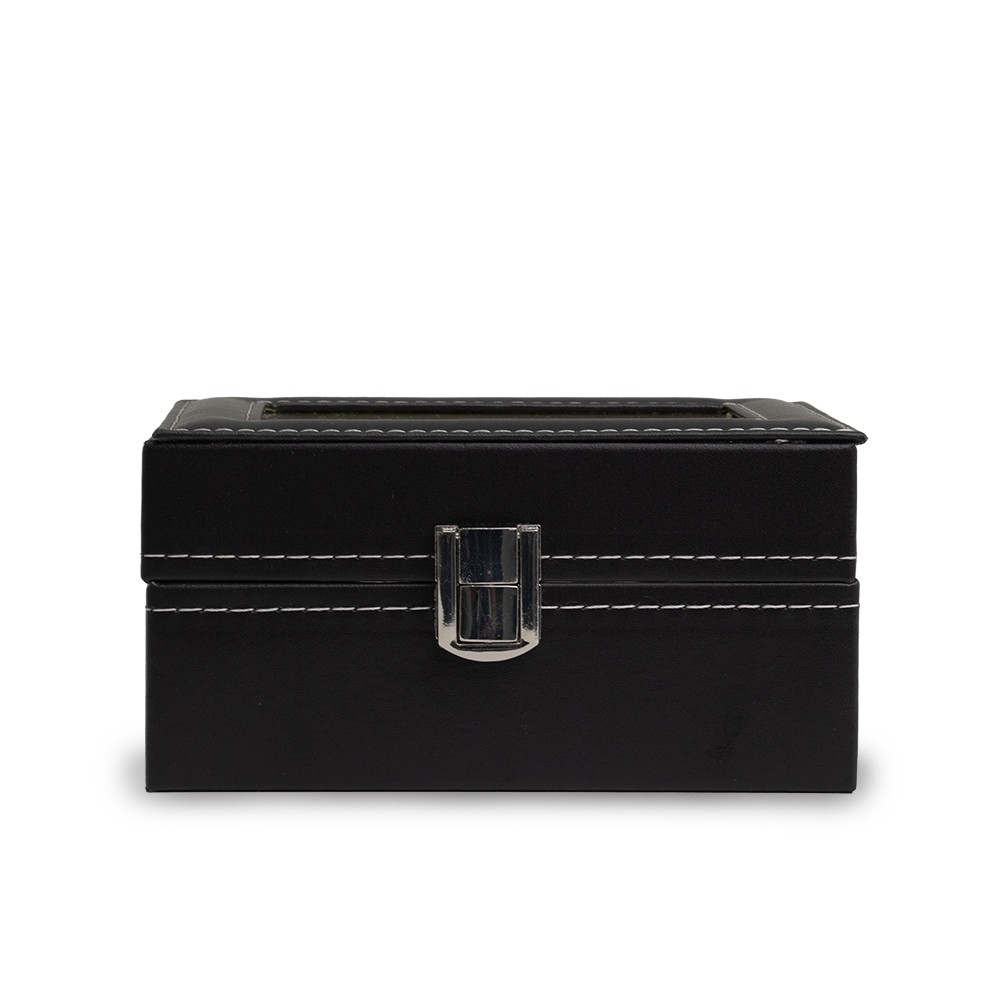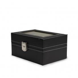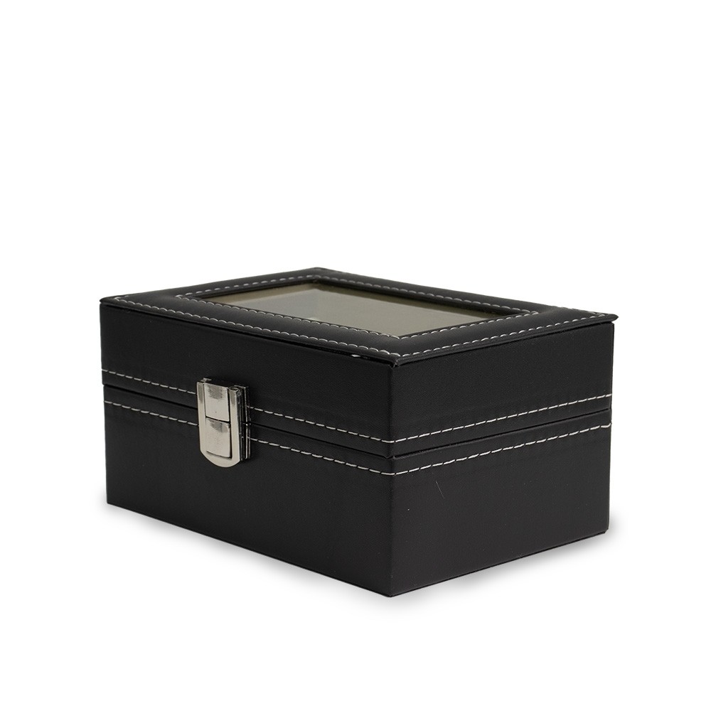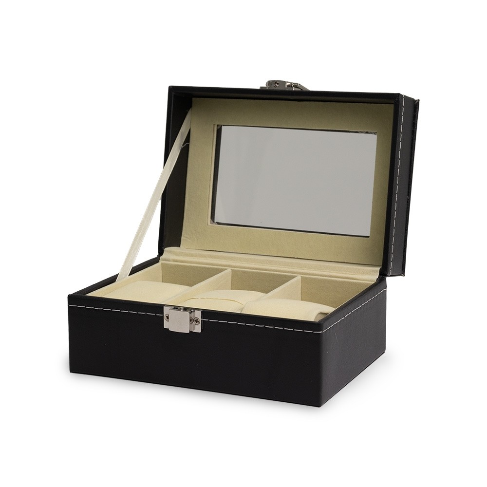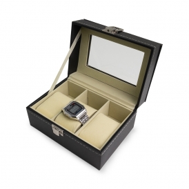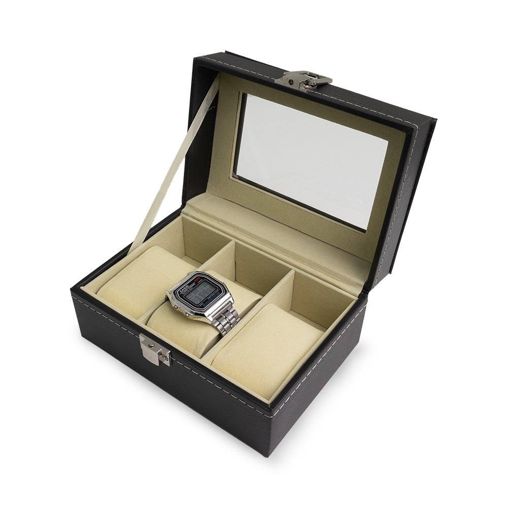 Descrição: Porta relógios em couro sintético com revestimento aveludado. Possui três divisórias com almofadas para relógios, visor em acrílico e fechadura com trava.
