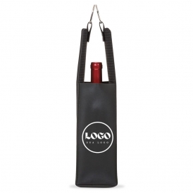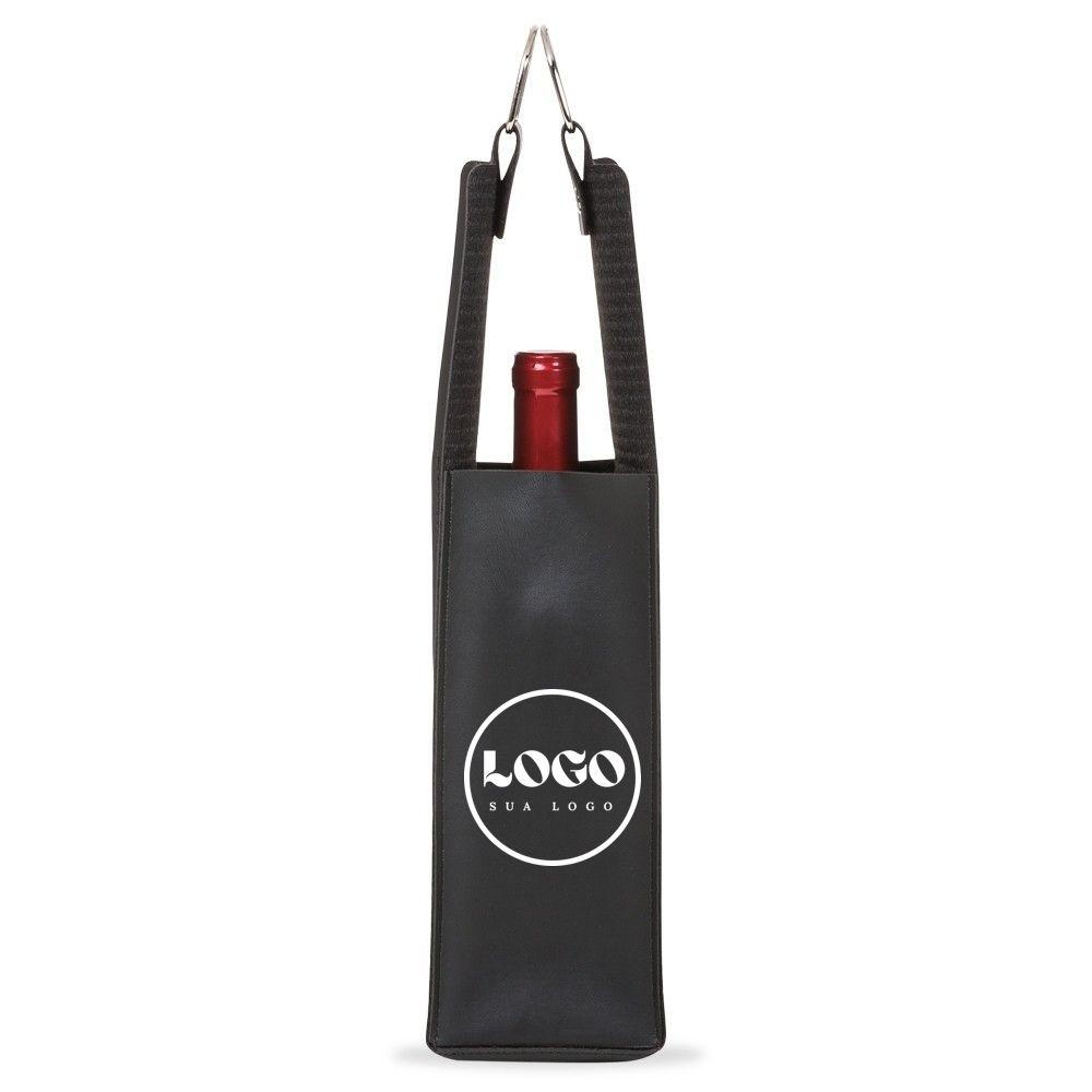 Descrição: Estojo porta vinho em couro sintético bidim, contém duas alças metálicas e botão para lacre.