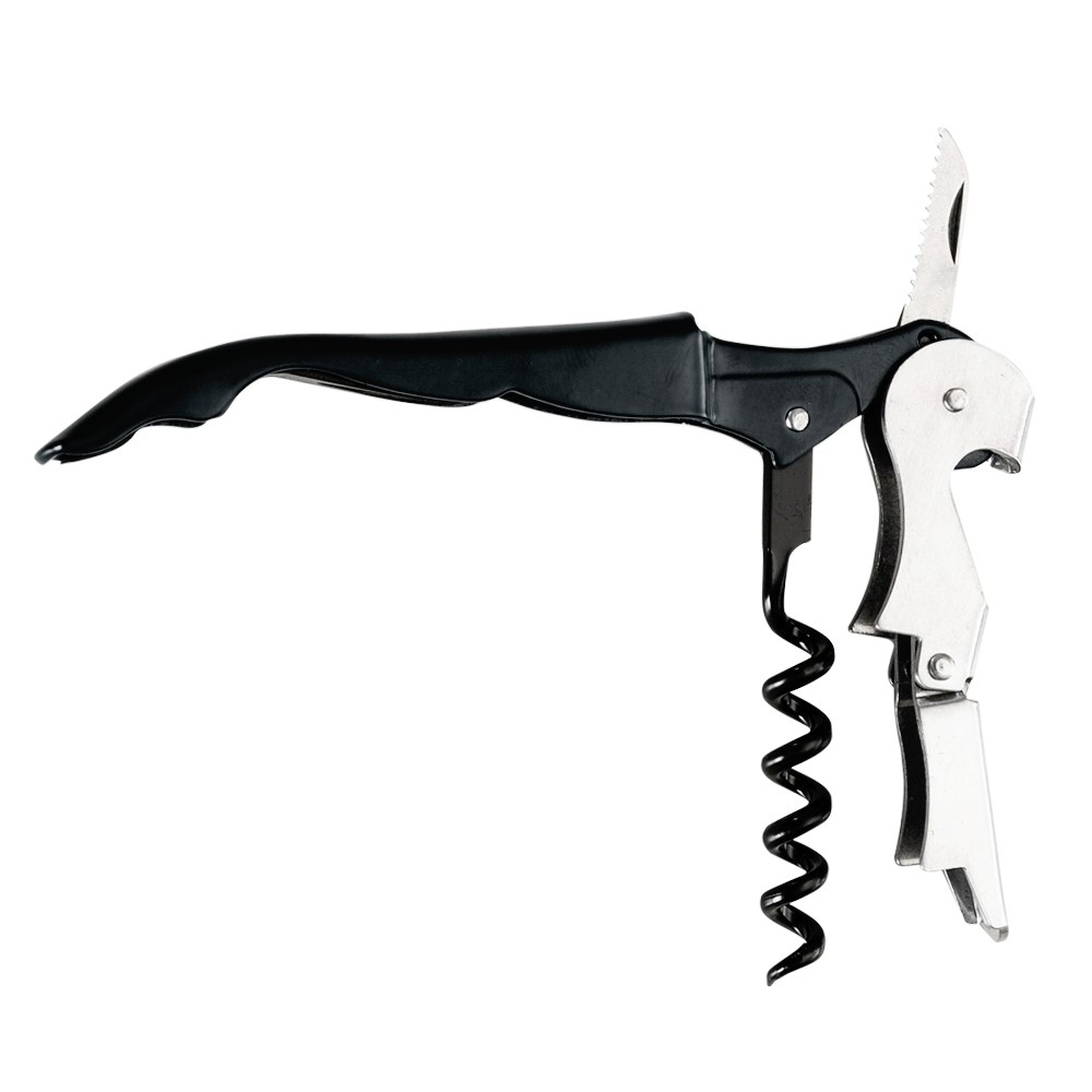 Descrição: Saca-rolhas metálico de 2 estágios com acabamento brilhante. Contém abridor de garrafa, lâmina de corte e saca-rolhas.