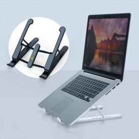 Descrição: Suporte retrátil para notebook com ângulos reguláveis. Com “esteiras” de silicone antideslizantes, o suporte contém seis posições para regulagem que se adaptam conforme a necessidade do usuário, promovendo um maior conforto e aperfeiçoando a ergonomia durante sua utilização. Sua estrutura de corte aberto torna a circulação de ar excepcional, acelerando o resfriamento do notebook e propo
