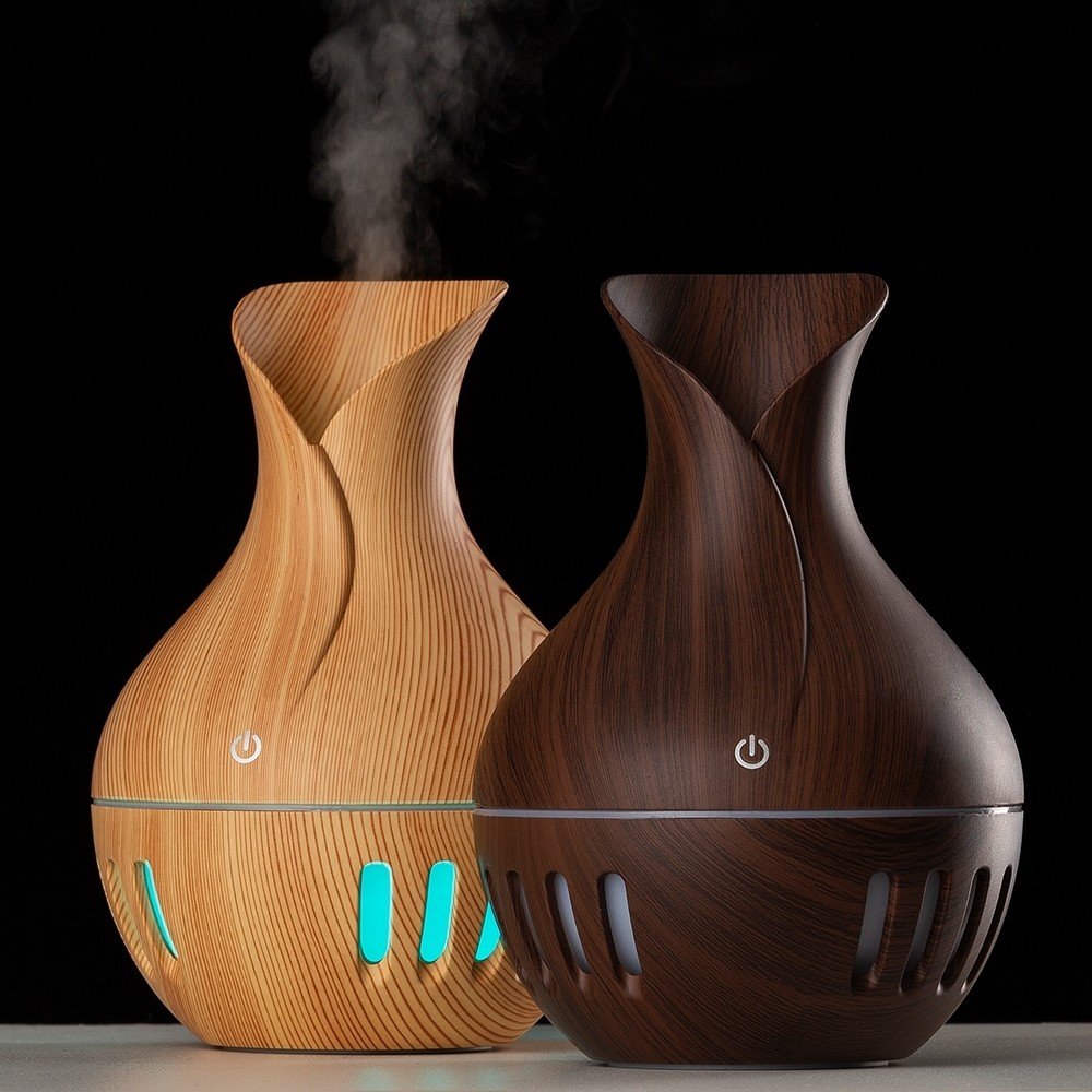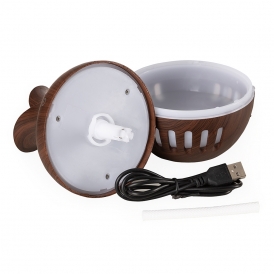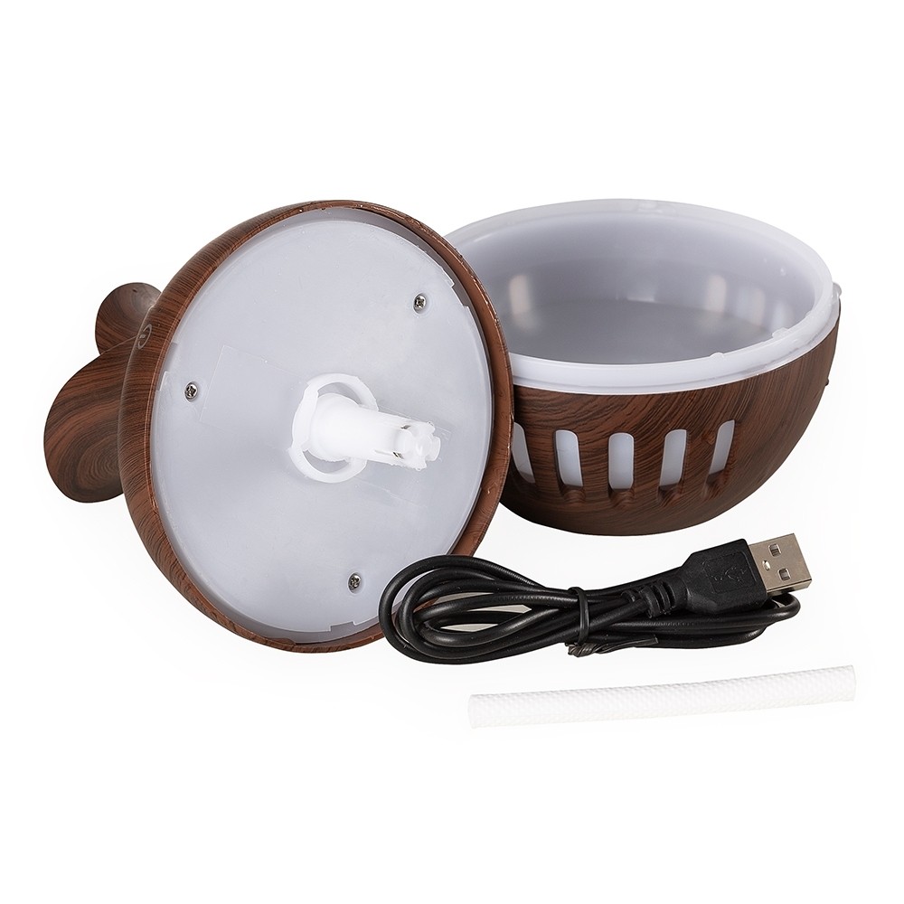 Descrição: Umidificador ultrassônico com show de luzes em led. Produzido em material plástico com estilização similar a madeira, o umidificador possuí capacidade de até 130ml e funciona apenas a base de água. O produto não armazena carga, a sua utilização só pode ser feita com cabo USB. Taxa de consumo de <3W e taxa de tensão de DC5V. Acompanha refil de filtro de algodão e um cabo USB.